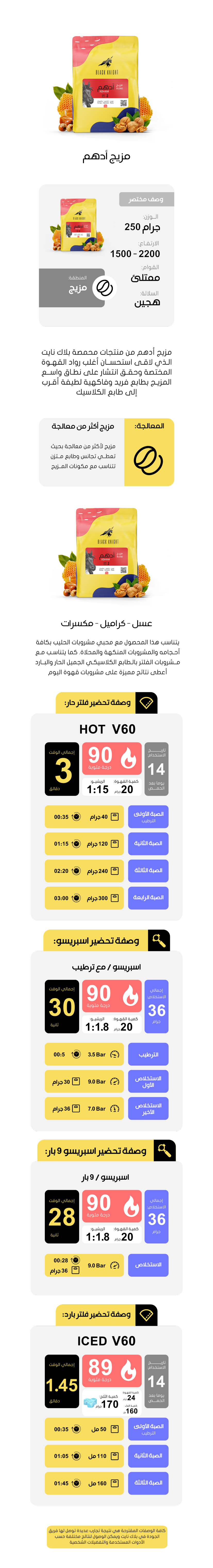 مزيج أدهم هو مزيج فريد من نوعه يتميز بأنه مناسب للقهوة المقطرة و أيضاً الإسبريسو و مشروبات الحليب، مذاقه مختلف ليس كأي مزيج فمن الوهلة الأولى سوف تظن بأنه من مصدر واحد و يشابه المحاصيل الأثيوبية الكلاسيكية ، نفخر بتقديمه كأول مزيج لدينا في بلاك نايت والذي اخذ منا في اعداده أشهر طويله ، هذا المزيج يتمتع بقوام ممتلىء و عطرية لطيفة و حلاوة عالية و فاكهية بسيطة ، هذه القهوة تليق بأن تبدء بها صباحك وسوف يتفق على حبها جميع الأذواق وهذا ماحرصنا عليه.