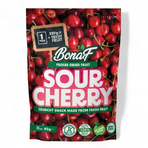كرز طبيعي مجفف بتقنية التجميد للحفاظ على الطعم الحامضي والقوام المقرمش.